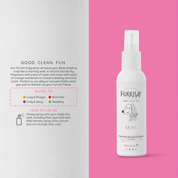 Geef je hond een heerlijk frisse geur met Furrish Ariel Female Cologne! Deze zachte en verfijnde cologne is speciaal ontwikkeld voor teefjes en laat een langdurige, frisse geur achter zonder de huid of vacht te irriteren. Perfect om je hond tussen wasbeurten door op te frissen!